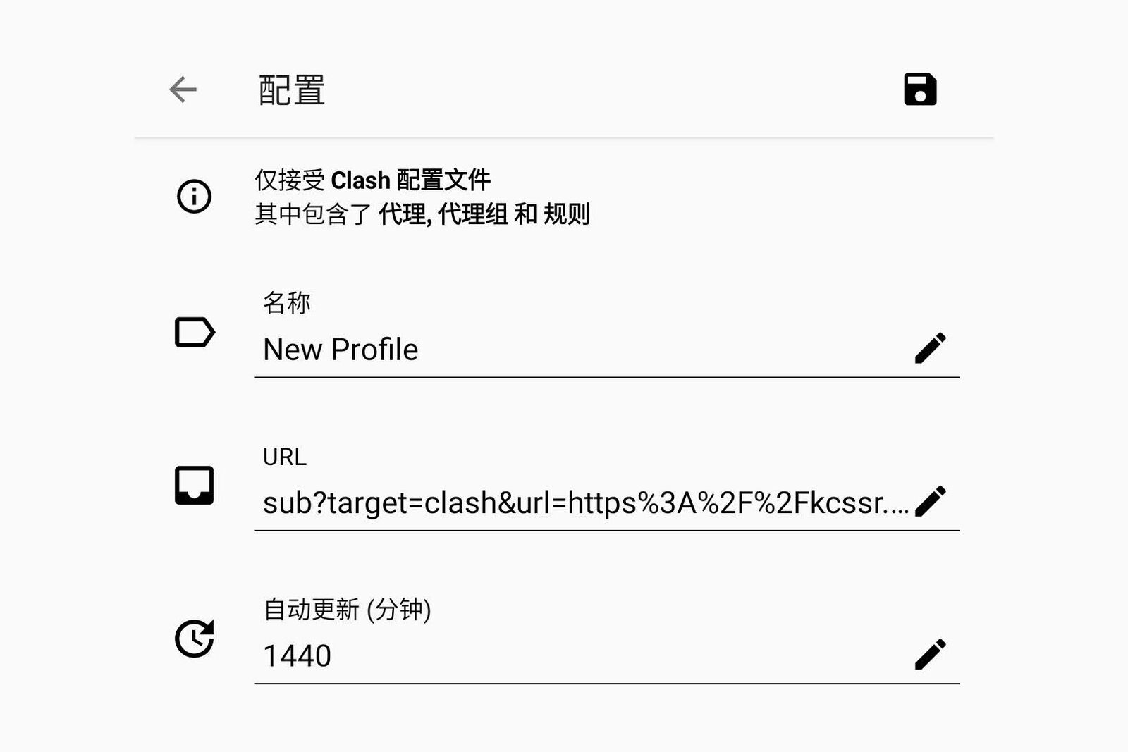 完成后点击右上角的保存按钮,Clash for Android 将下载配置文件,请点击选中添加的配置文件。