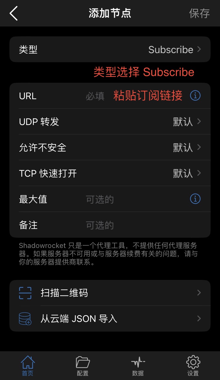 复制订阅链接,在 Shadowrocket 首页点击右上角 ➕ 打开添加页面。