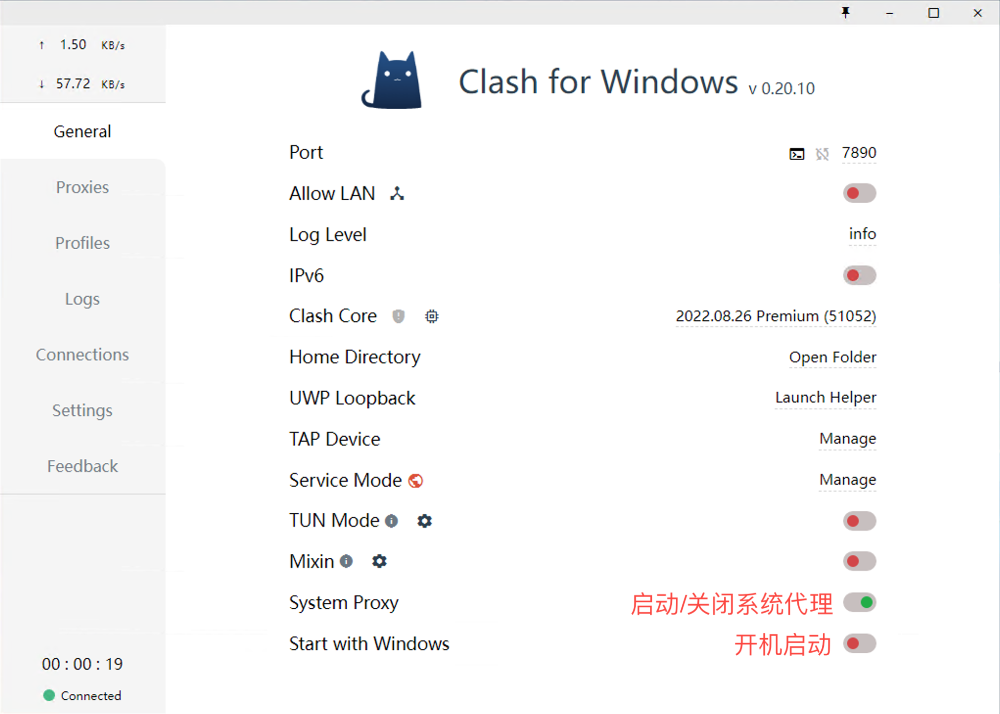 设置代理:进入 General 界面,选择 System Proxy 即可启动代理。其中 Start With Windows 代表是否开机后自动运行。